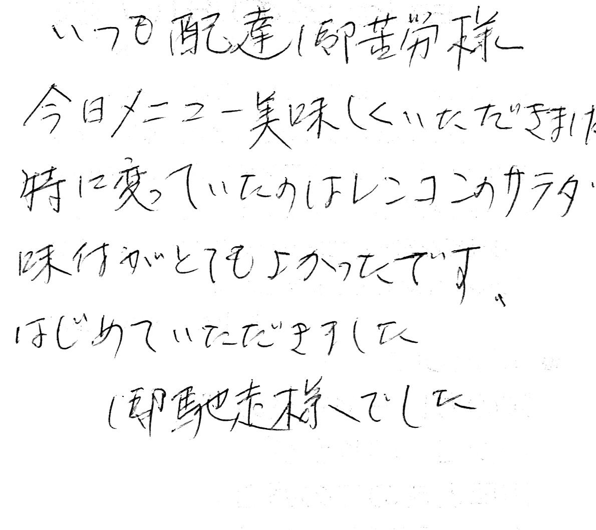 ライフデリ府中店へお弁当の感想を頂戴致しました。 「いつも配達御苦労様 今日メニュー美味しくいただきました 特に変っていたのはレンコンのサラダ味付けがとてもよかっです。」 ライフ…