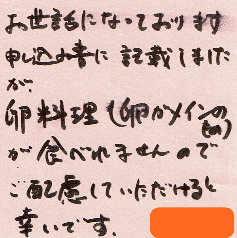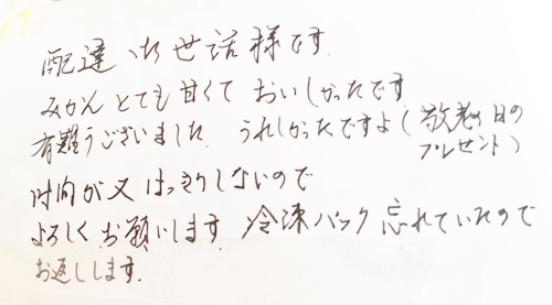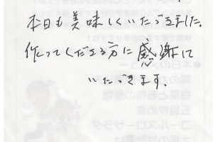 「いつも美味しいお弁当を届けていただきありがとうございます。感謝しております。お陰さまで元気で過ごすことができてうれしく思っております。」