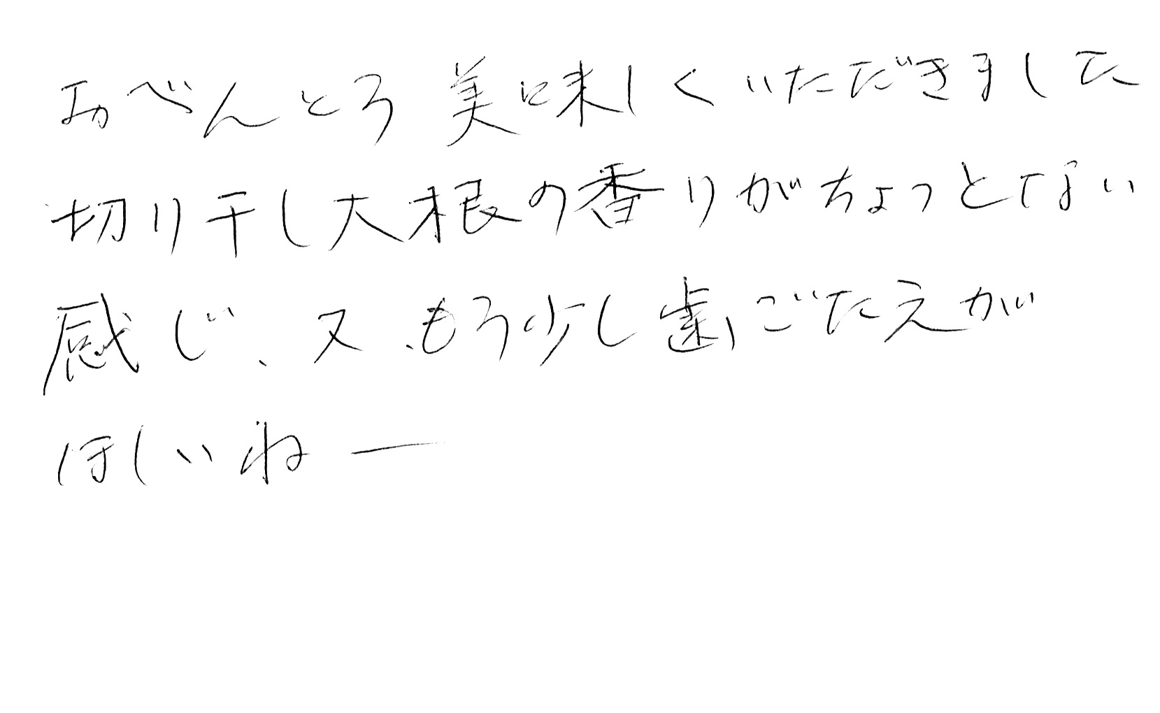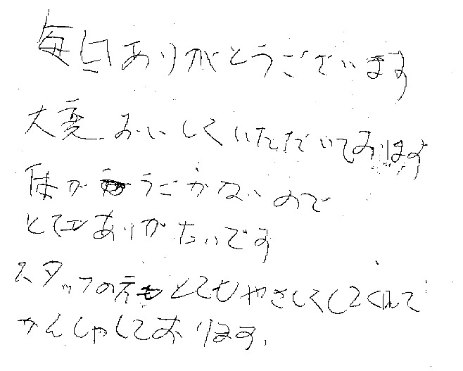 娘様がご両親のお食事を心配され、色々なお弁当屋さんに依頼をされたみたいですがなかなか受け入れてくださらなかったそうです。ケアマネ様から相談いただきお届け時にお手紙を添えたりなどの対応をしていく中、受け入れて下さるようになり、ご家族様がとても喜んでくださっております。このようなご家族様の仲の良さがうかがえる年賀状を頂けてとてもありがたく、また励みになります。ありがとうございました。