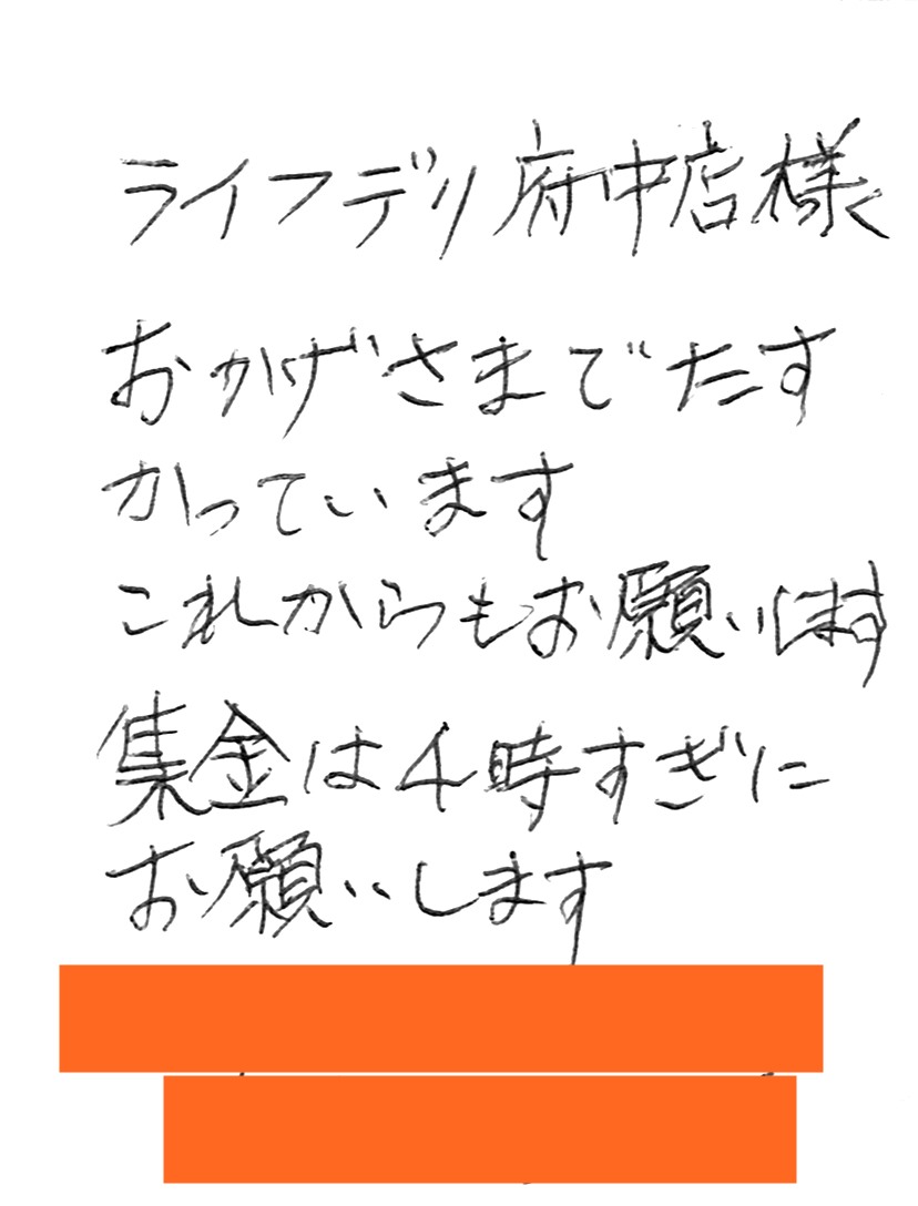 ライフデリ横浜鶴見・中店へのお手紙をご紹介します。