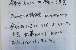 お客様のご利用人数が1人増えるとのことで、翌日からの対応が希望とのことでしたので、対応いたしました。 その対応に感謝していただいたようで、お手紙をいただきました。 おいしく食べられているとのことで、こちらも安心しました。ありがとうございました。