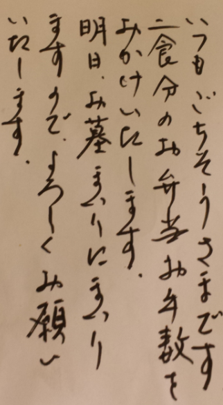 「弁当屋さん、いつもありがとうございます おいしくいただいています というお手紙をいただきました。」とのことです。