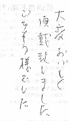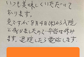 夏バテで食欲が無く元気が無かったお客様でしたが、配食を始めた翌日に感謝のお手紙をいただきました。認知症の方でしたが、配食のことを覚えて下さりお手紙まで書いていただたことにとても嬉しく思いました。今では毎日美味しかったよ、と仰っていただいて感謝の毎日です。ありがとうございました。