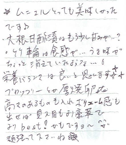 「毎日のお弁当ありがとう。母は毎度完食しうれしい顔をみることができました。今年のお正月のおせちにはヘルパーさん等「おいしそう」とすごい話題にのぼりました又四季を感じるコラムを読ませて頂きました。本当に長い間ありがとうございました」とのことです。