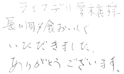 ライフデリ厚木・伊勢原店へのお手紙をご紹介します。 「長い間夕食おいしくいただきました。 ありがとうございます。」とのことです。 一年半ほどお弁当をご注文頂いたお客様が入所のため辞めることとなり最後のお届けの際にお手紙を…