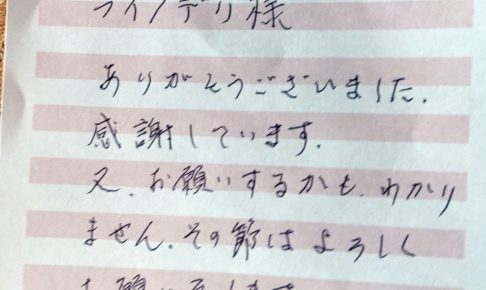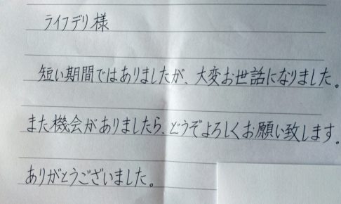 ライフデリ古賀・福津・新宮店へのお手紙をご紹介します。 「「ライフデリ様ありがとうございました。感謝しています。又、お願いするかもわかりません。その節はよろしくお願い致します。」」とのことです。 オープンして初めてのお客…