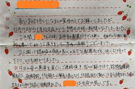 ライフデリ厚木・伊勢原店へのお手紙をご紹介します。 「大変お世話になりました。ありがとうございました。 というお手紙を頂戴しました。」とのことです。 認知症のお客様で毎日の安否確認とお昼のお弁当のご注文を頂いていました。…