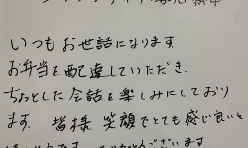 ライフデリ彦根店へのお手紙をご紹介します。 「昨日のごはんおいしかった。 全部食べた。」とのことです。 今月よりケアマネージャーさんからご紹介のお客様よりメッセージを頂きました。 ペンがうまく使えないとの事で、スタッフが…