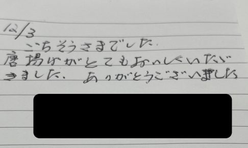 ライフデリ中野店へのお手紙をご紹介します。 「ごちそうさまでした。 唐揚がとてもおいしくいただきました。 ありがとうございました。」とのことです。 当店を半年以上継続して昼食と夕食を毎日ご利用されてたお客様です。 配達の…