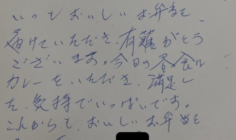 ライフデリ中野店へのお手紙をご紹介します。 「いつもおいしいお弁当を届けていただき有難うございます。 今日の昼食はカレーをいただき満足した気持ちでいっぱいです。 これからもおいしいお弁当を届けて下さい。」とのことです。 …