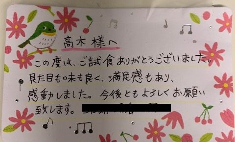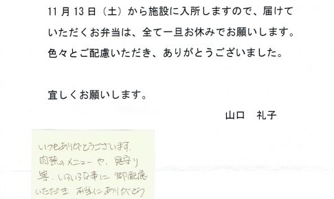 ライフデリ彦根店へのお手紙をご紹介します。 「完食です。 いつもありがとうございます。」とのことです。 継続してムース食ご利用のお客様です。 いつもお弁当の空箱にメッセージを付けてお返し頂いております。 お客様からの嬉し…