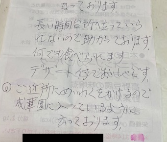 ライフデリ八王子店へのお手紙をご紹介します。 「いつもありがとうございます おいしくいただいております」とのことです。 食事に困ってるお客様 毎日の配達で助かってるとの事です お弁当の回収時に弁当箱と共に頂きました 八王…