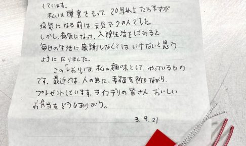 ライフデリ福岡西店へのお手紙をご紹介します。 「美味しくいただきました 21年5月 というお手紙を頂戴しました。」とのことです。 普段はおかずのみの配食の方でしたが、当日は多めに炊いた炊き込みご飯をサービスさせていただき…