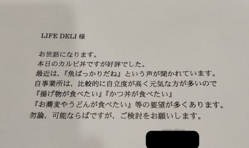 ライフデリ豊田店へのお手紙をご紹介します。 「何時もおいしいおべんとうありがとうございます。」とのことです。 ご利用開始から半年程、週3回ご利用されているお客様です。集金の際に頂いたお手紙です。 豊田市でご高齢向けのお弁…