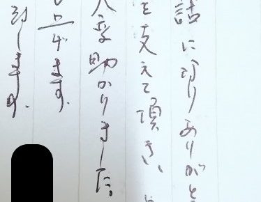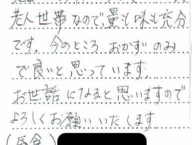 ライフデリ宮崎店へのお手紙をご紹介します。 「「先日はありがとうございました。老人世帯なので量も味も充分でした。今の所おかずのみで良いと思言っていますお世話になると思いますのでよろしくお願いします」という内容のお手紙です…