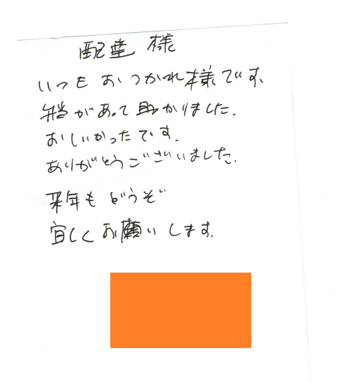 ライフデリ横浜鶴見店へお客様より新年のご挨拶を頂戴いたしました。 新年のご挨拶と合わせ、日頃の感謝のお言葉を頂戴しました。ありがとうございます。 本年も横浜鶴見店をどうぞよろしくお願い致します。  …