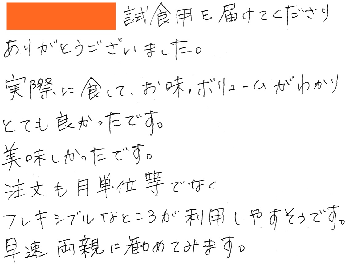 ライフデリ府中店へ感謝のお手紙を紹介します。 「実際に食して、お味、ボリュームがわかりとても良かったです。美味しかったです。注文も月単位等でなくフレキシブルなところが利用しやすそうです。」 お…