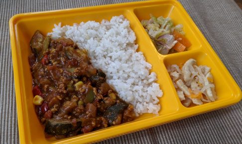 8月27日(土)夕食での提供予定です。ルーはキーマカレーのようなとろみ具合のルーです。 具材はカレーの定番の玉ねぎと豚肉に、夏が旬のトマト、ズッキーニ、とうもろこしを使用しています。さらに彩にパプリカを加えています♪ ※…