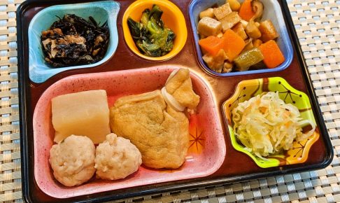 8月1日(月)夕食の提供予定です。えび入り団子が2個、巾着煮と大根が1個ずつ付いています。 優しい味付けで一口食べると、ホッコリします。夏は刺激のあるカレーもいいですが、たまには箸休めになるようなメニューもいいですね。 …