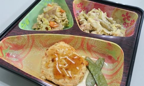 医療食を検討されている方にご参考頂けるように実際に提供されたメニューをご紹介したいと思います。今回は「カロリー調整食」のおかずセットです。【メニュー】・つくねの照り焼き・キヌサヤ・白菜と麩の玉子とじ・インゲンとツナのマス…