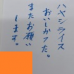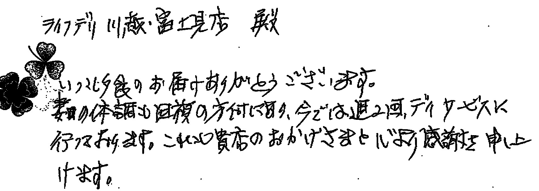 お客様の声2021.03.09 DELILIFE ライフデリ中野店にお手紙を頂戴しました! ライフデリ中野店へのお手紙をご紹介します。 「牛焼肉弁当、美味なお弁当を届けて頂き有り難うございました。だいぶ、三月一日になり気持ちも春らしくなり、美味しなお弁当を毎日いただいているので、おかげ様で元気になりました!」とのことです。 「いつもお手紙を書くのを日課にしてるんだよね」と仰っている利用者様です。1日3食、週7日お届けしています。ありがとうございました。 中野区でご高齢向けのお弁当をお探しの方、糖尿病・腎臓病の方は是非、高齢者配食サービスのライフデリ中野店にお任せ下さい。