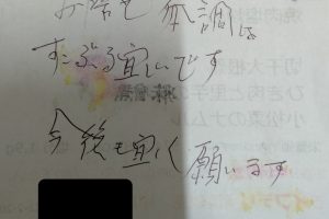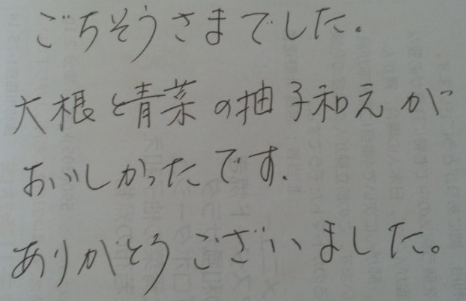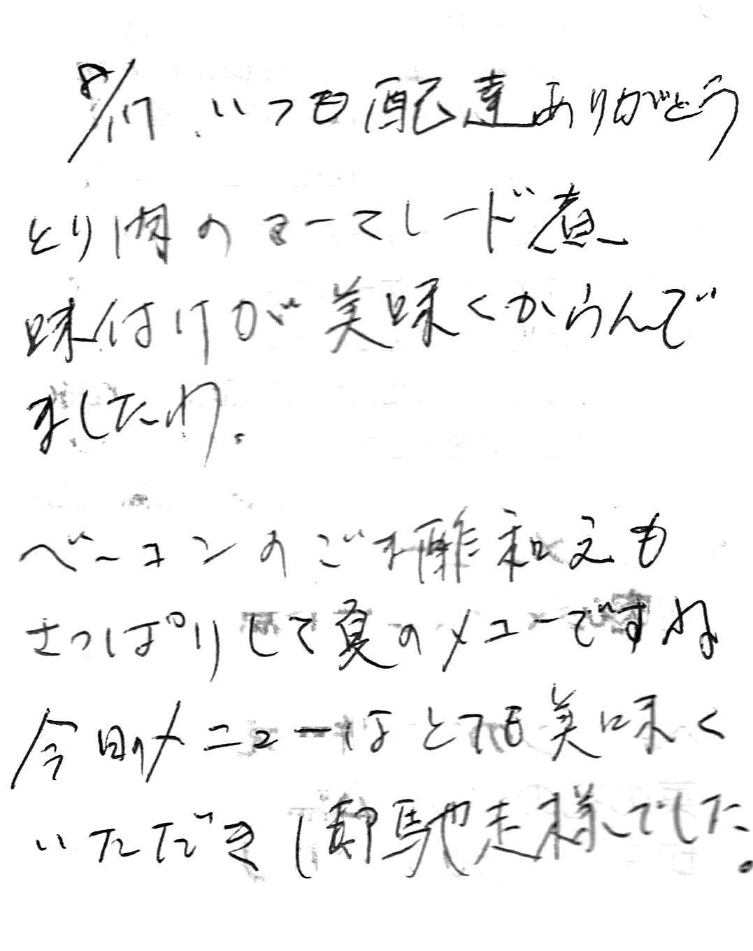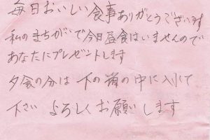 お客様の声2023.02.05 LIFEDELI ライフデリ京都北店にお手紙を頂戴しました! ライフデリ京都北店へのお手紙をご紹介します。 「久しぶりの雪 足元のわるい中 配達して頂いて ありがとうございます」とのことです。 開店時に近隣店より引継ぎを受けたお客様です。普段は非接触で玄関先へ置き配するお客様ですが、先日の大雪の際に返却の食器にお手紙を同封頂きました。 京都市北区でご高齢向けのお弁当をお探しの方、糖尿病・腎臓病の方は是非、高齢者配食サービスのライフデリ京都北店にお任せ下さい。