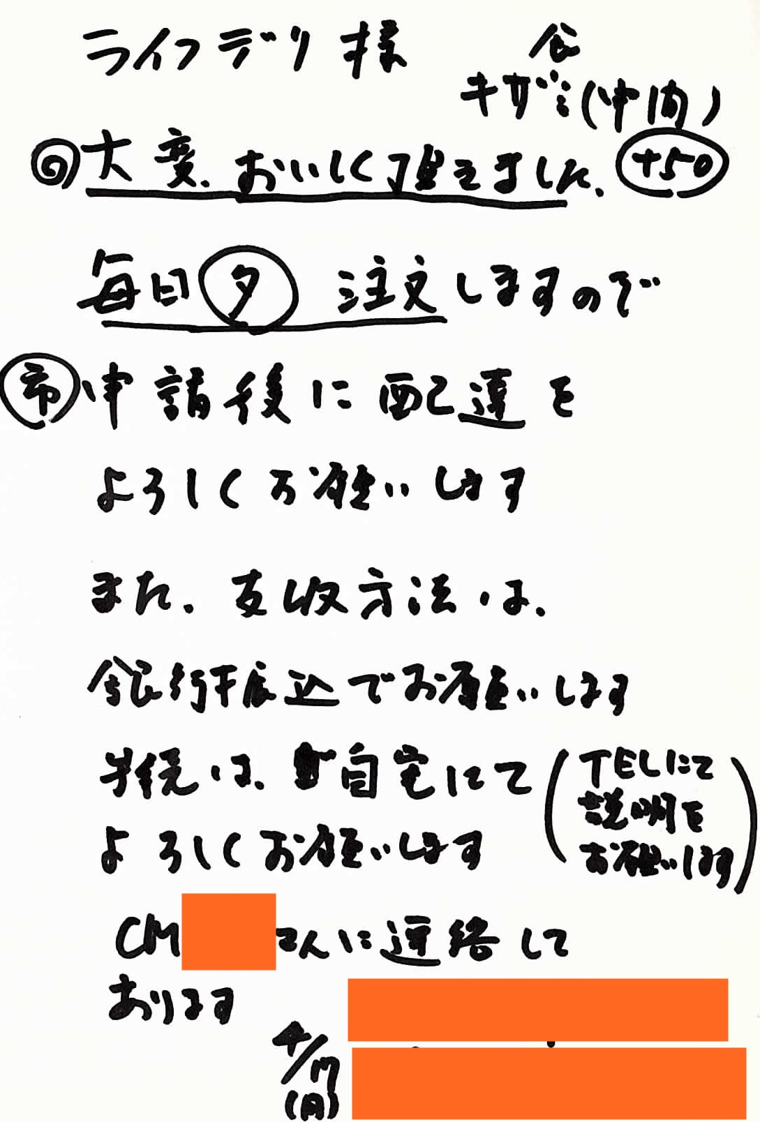 お客様の声2022.10.24 LIFEDELI ライフデリ伊東店にお手紙を頂戴しました! ライフデリ伊東店へのお手紙をご紹介します。 「ごちそうさま。とてもおいしかったです。福元」とのことです。 ご試食にお持ちしたお弁当の容器を回収した時に『今後ともよろしくお願いします』とお声掛けと共に頂いたお手紙です。 伊東市でご高齢向けのお弁当をお探しの方、糖尿病・腎臓病の方は是非、高齢者配食サービスのライフデリ伊東店にお任せ下さい。