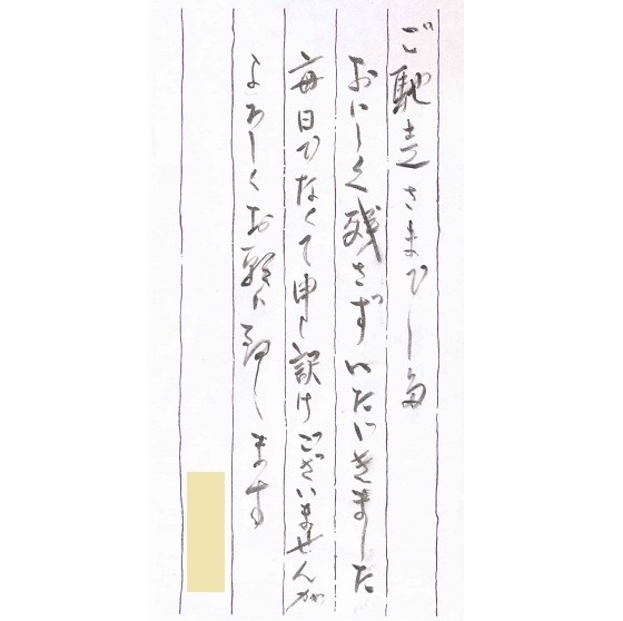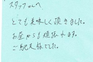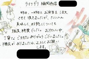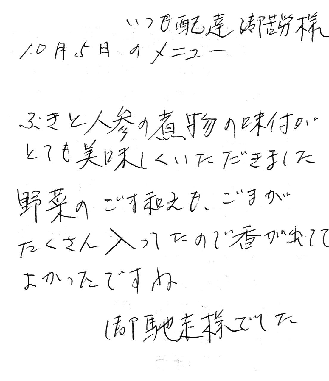 お客様の声2022.08.06 LIFEDELI ライフデリ伊東店にお手紙を頂戴しました! ライフデリ伊東店へのお手紙をご紹介します。 「いつも美味しく頂いております。急ですが入院となりましたので弁当は休みます。退院したら電話します。」とのことです。 前回退院されてからお弁当をお届けさせて頂いていたお客様です。急遽、再入院となられ大変な時にお弁当の事をお気遣いいただき逆に恐縮です。早く良くなられてまたお届け出来る日を楽しみにしてお待ちしております。 伊東市でご高齢向けのお弁当をお探しの方、糖尿病・腎臓病の方は是非、高齢者配食サービスのライフデリ伊東店にお任せ下さい。