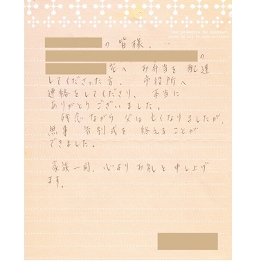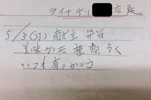 お客様の声2021.09.18 LIFEDELI ライフデリ加古川店にお手紙を頂戴しました! ライフデリ加古川店へのお手紙をご紹介します。 「いつも美味しいお弁当をありがとうございます。 美味しそうなお菓子をありがとうございます。 」とのことです。 毎日スタッフさんの昼食、夕食を注文してくださるリラクゼーションサロンに、宣伝も込めて冷凍どら焼きをプレゼントしたところ、お礼のお手紙をいただきました。 加古川市でご高齢向けのお弁当をお探しの方、糖尿病・腎臓病の方は是非、高齢者配食サービスのライフデリ加古川店にお任せ下さい。
