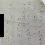 デイサービスの日以外は毎日昼夜注文頂いており、いつも配達の時にご丁寧に感謝のお言葉を下さるお客様です。今回、お誕生日でしたのでお弁当にお届け票と一緒にお誕生日カードを付けさせていただきました。お誕生日カードを喜んでいただきお手紙を頂戴しました。ありがとうございました。