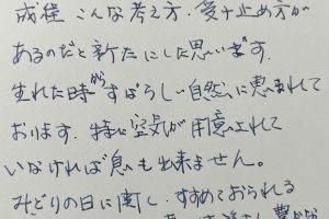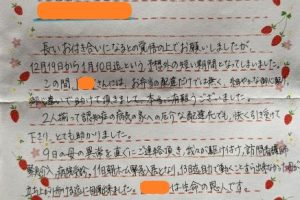 「「Birythday Card ありがとうございました。寒い日・暑い日・雨の日・風の日・毎日いつも配達下さり感謝致しております。これからもどうぞよろしくお願い申し上げます。」というお手紙を頂戴しました。」とのことです。