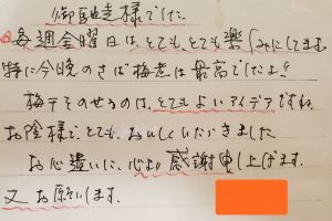 ケアマネジャーからのご紹介でご試食をして頂き、結果をお電話でお伺いしたところ、お手紙の内容のお言葉を頂きました。事前にご飯柔らかめとのご要望がありました。通常通りでご提供し心配でしたが丁度良い柔らかさとご飯が美味しいということで2回/週(DSの都合)での開始となりました。お電話での内容を更にお手紙で頂戴しました。