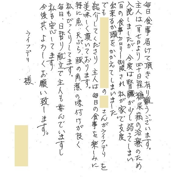 「「いつも美味し弁当をありがとうございます。ヘルパーの–と言います。ご本人がいつも『おいしそう~』、『わあおいしい~』と喜びの声とともに食べておられる事をお伝えしたいと思います。聞いている私もうれしくなります。今日の蓮根のきざみは『固くて食べられません』との事でした。不満をのべているのではなく、伝えておいた方が良いかなくらいの感じです。感謝をこめて。」というお手紙を頂戴しました。」とのことです。