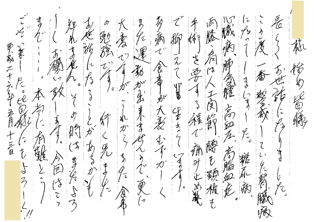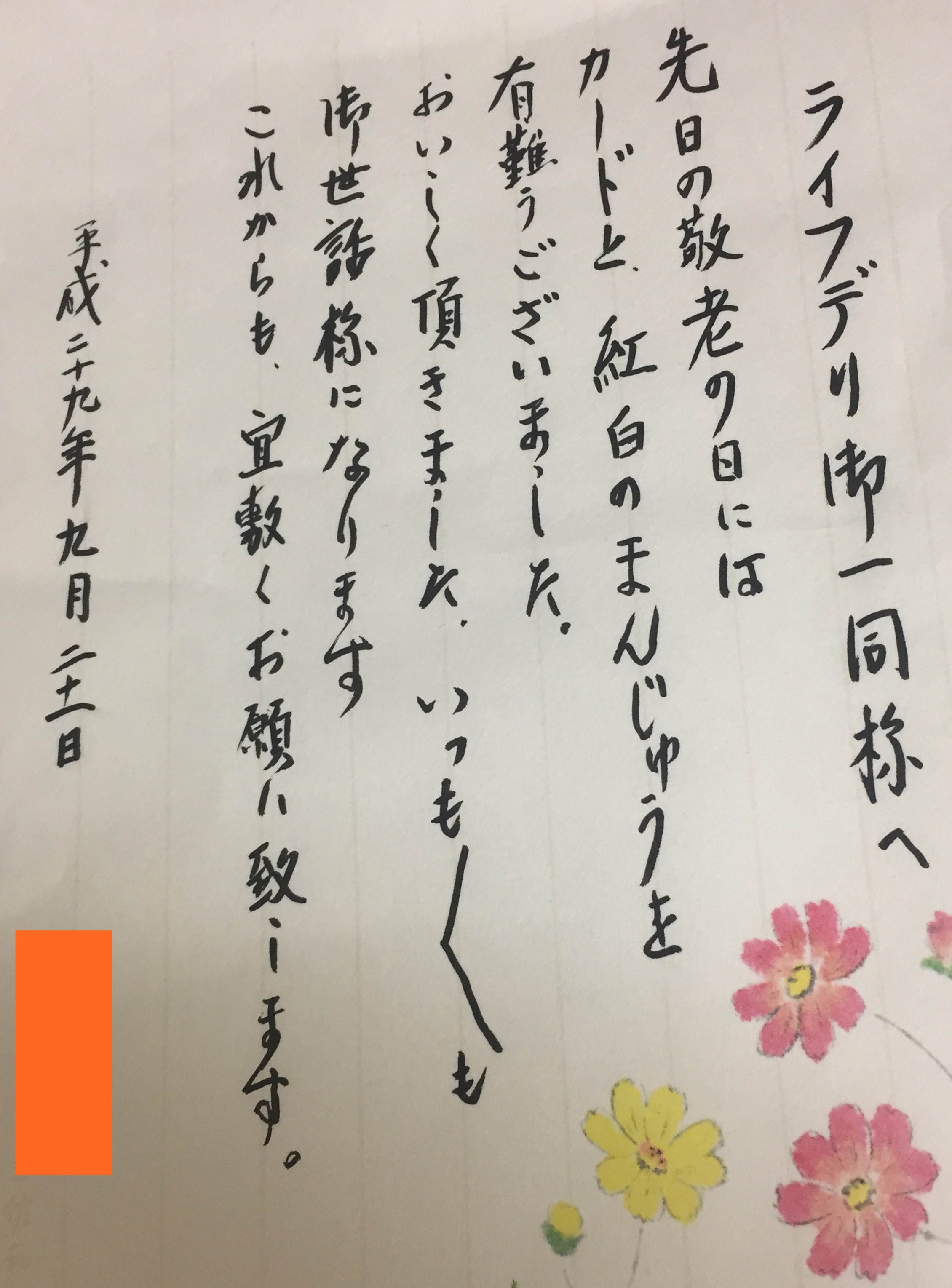 地域包括支援センター様が開催された家族の会にて、当社の配食サービスをご紹介いただきました。容器の回収を伺った際にお手紙を頂戴しましたありがとうございました。