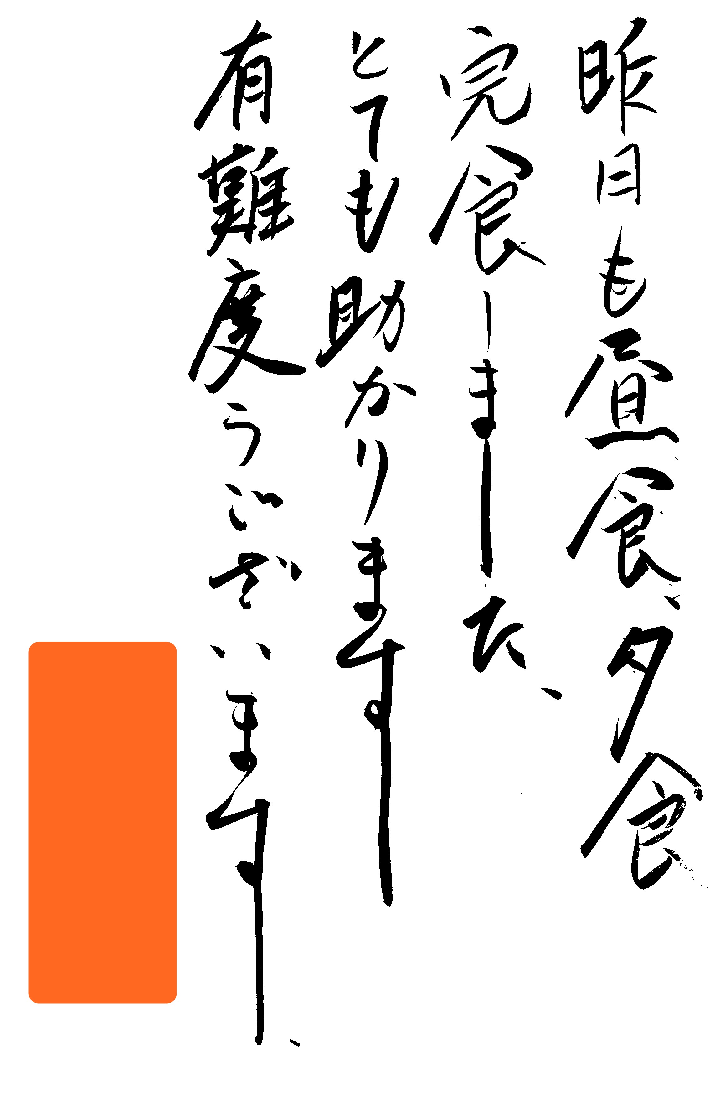 お客様の声2018.08.20 2018.09.06 DELILIFE ライフデリ宮崎店にお手紙を頂戴しました! ライフデリ宮崎店へのお手紙をご紹介します。 「「ライフデリさんへ来週の配達申し訳ないですが、入院のため休みます」というお手紙を頂戴しました。」とのことです。 最近開始されたお客様でおかずの味が良いとお褒めくださってました。少し体調を悪くされ1週間入院との事です。ありがとうございます。早くお体お元気になり、また配達でお会いできると良いですね! 宮崎市でご高齢向けのお弁当をお探しの方、糖尿病・腎臓病の方は是非、高齢者配食サービスのライフデリ宮崎店にお任せ下さい。