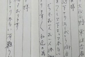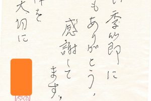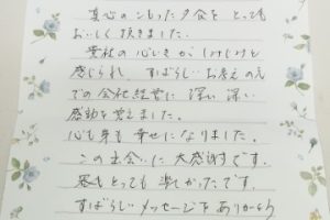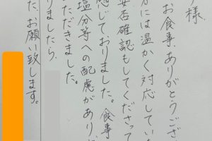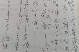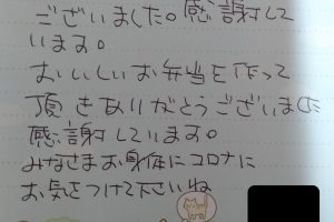 オープン時より、毎週日曜日にお弁当をお届けしていたお客様ですが、今ではお弁当を気に入っていただき毎日お弁当を届けております。 現在はスタッフ数も増えて、配達に行く事がなくなりスタッフとの会話を楽しみにしていた、お客様からのお手紙です。ありがとうございました。
