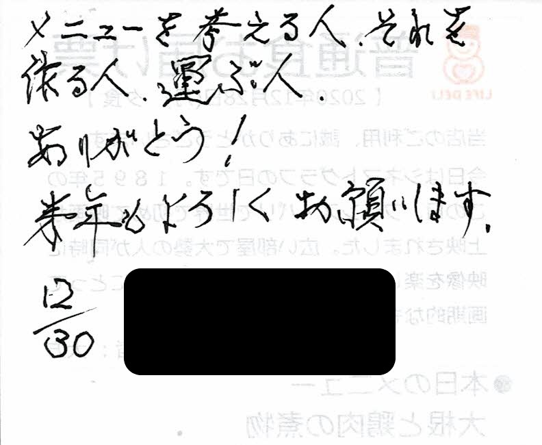 「メニューを作る人、それを作る人、運ぶ人ありがとう!来年も宜しくお願いします。」とのことです。