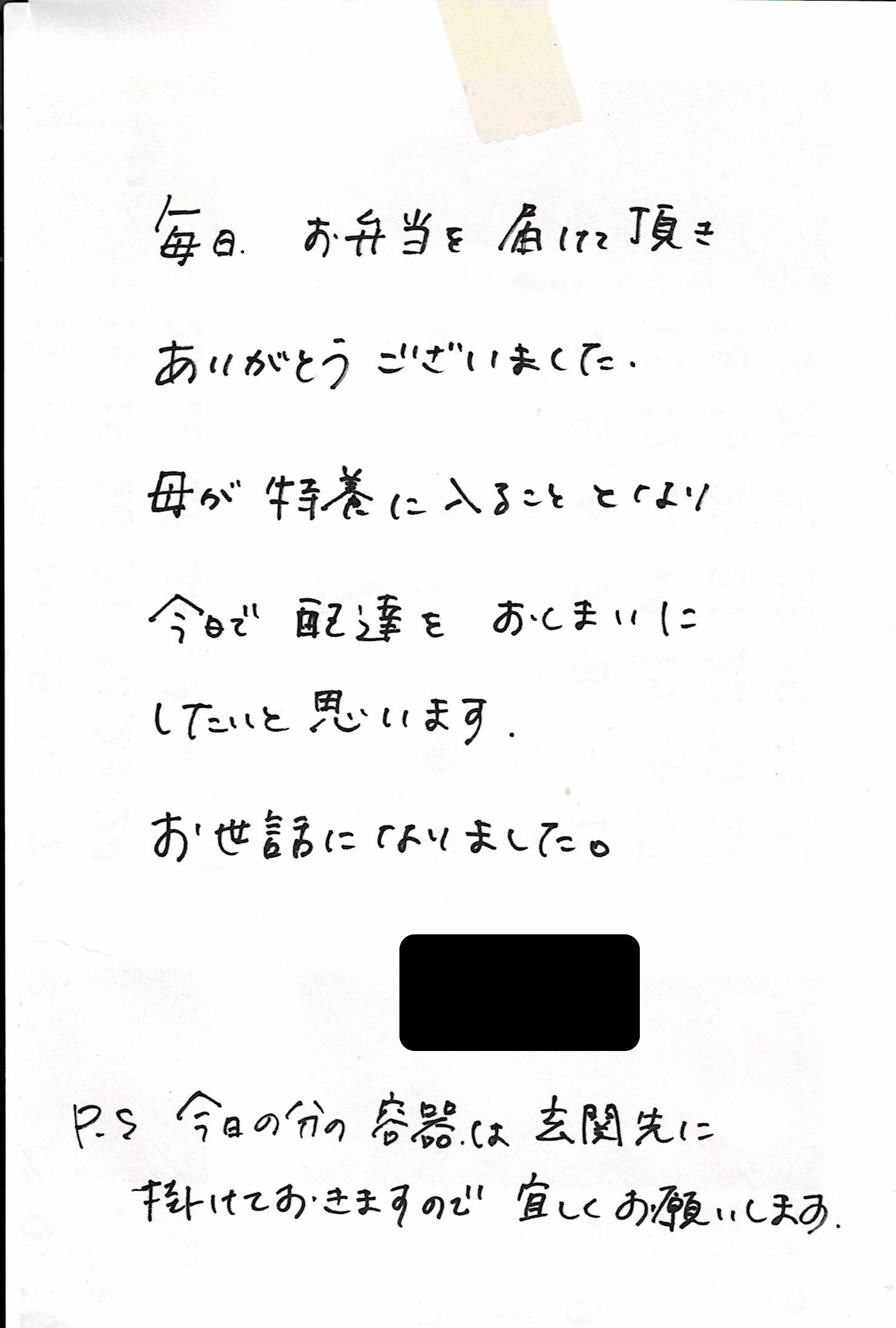 「毎日お弁当をお届け頂きありがとうございました。 母が特養に入ることになり今日で配達をおしまいにしたいと思います。お世話になりました。」とのことです。