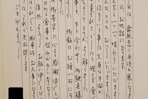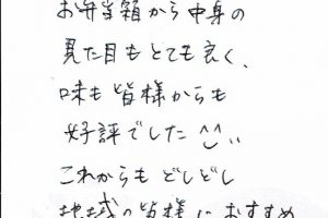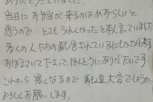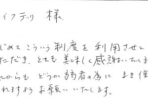ご体調を崩され息子様よりお電話を頂戴し昼食、夕食と2回配達をしているご利用者様です。息子様からも事細かに現在の状況や対応などもご指示頂きました。ご体調管理、安否確認を大切にする必要があるご利用者様から頂戴したお手紙です。ありがとうございました。