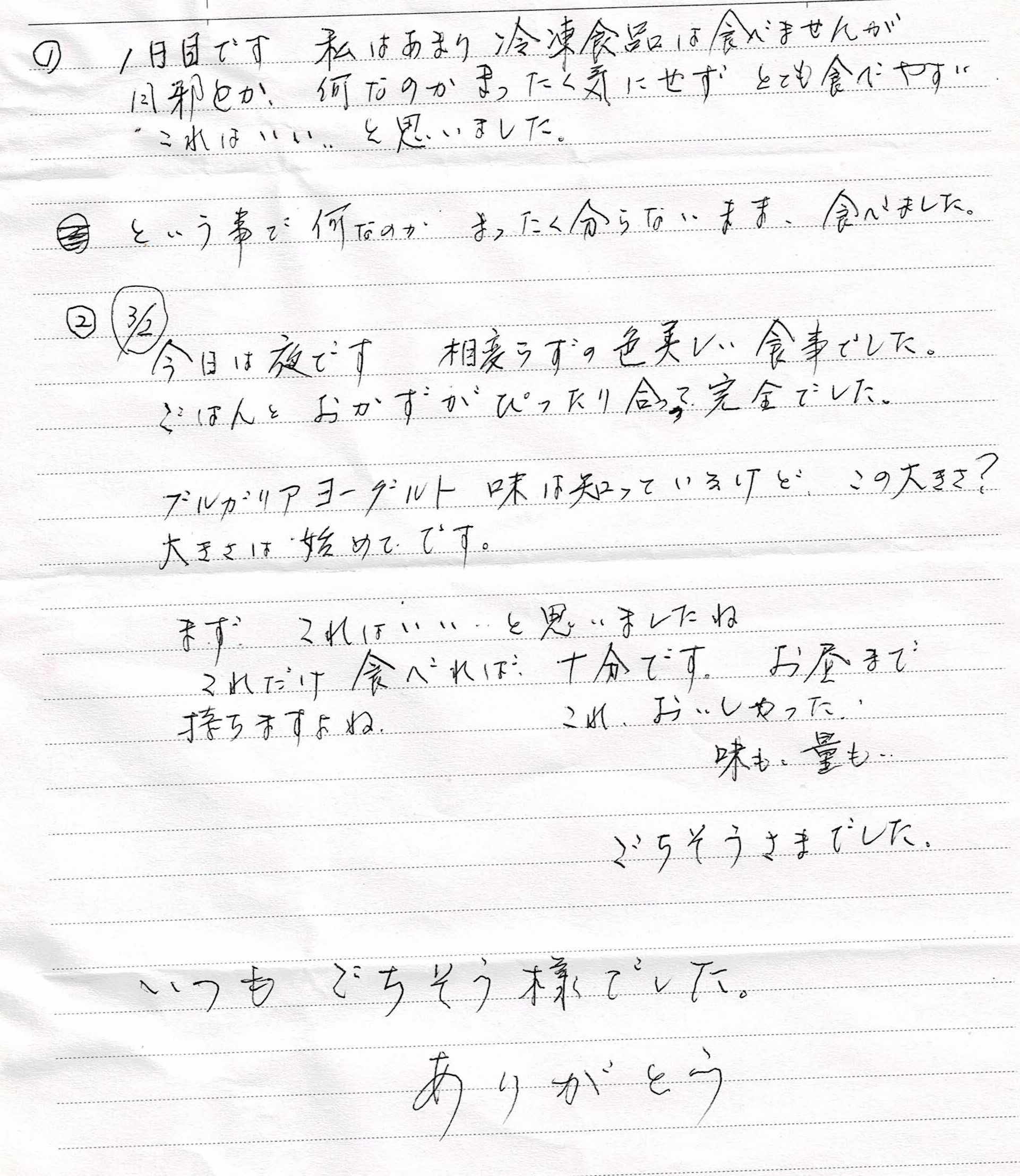 ご体調を崩され息子様よりお電話を頂戴し昼食、夕食と2回配達をしているご利用者様です。息子様からも事細かに現在の状況や対応などもご指示頂きました。ご体調管理、安否確認を大切にする必要があるご利用者様から頂戴したお手紙です。ありがとうございました。