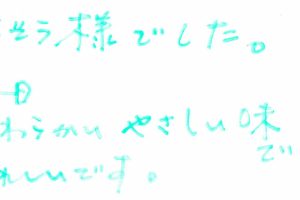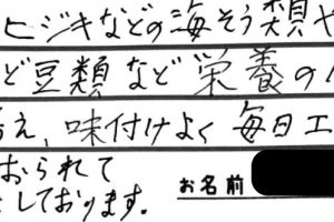 「毎日のお弁当ありがとう。母は毎度完食しうれしい顔をみることができました。今年のお正月のおせちにはヘルパーさん等「おいしそう」とすごい話題にのぼりました又四季を感じるコラムを読ませて頂きました。本当に長い間ありがとうございました」とのことです。