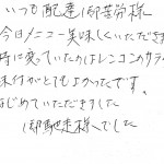 「いつも夕食のお届けありがとうございます。妻の体調も回復の方向にあり、今では週2回デイサービスに行っております。これも貴店のおかげさまと心より感謝を申し上げます。」