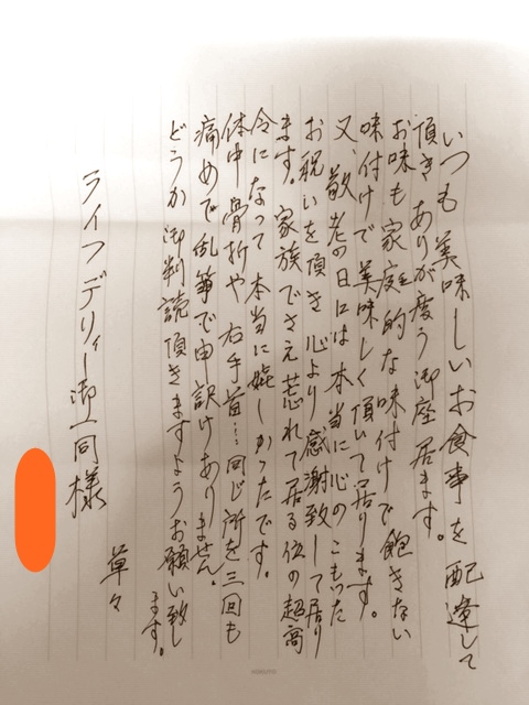 以前より当店をご利用いただいているお客様の紹介で 骨折等によりご自身での調理が困難な為、お弁当の配達を希望。ありがとうございました。