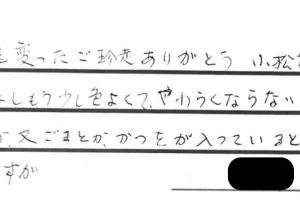 「母が亡くなってからの半年余り、一人になって心細かった父にお食事と共に いつも温かいお心遣いを頂いておりましたこと感謝しております。」