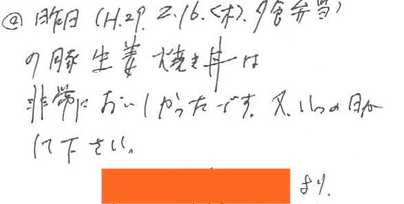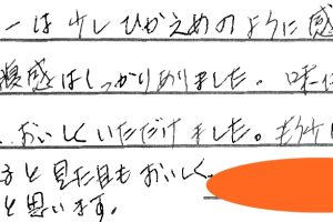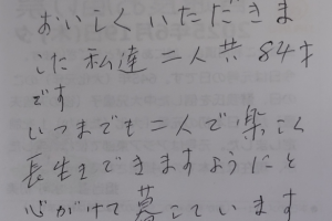 開業当初よりお付き合いいただいている大切なお客様です お父様、お母様のお弁当をご利用いただいております。 介護をされている息子さんご夫婦を少しでも助けられれば幸いに思っております。ありがとうございました。