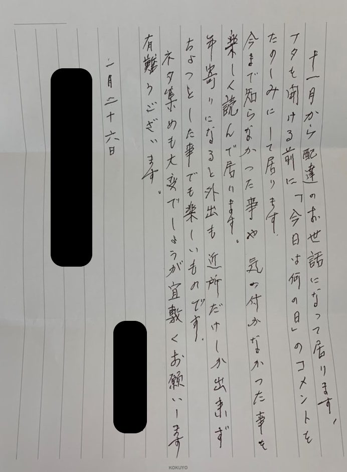 昨年の秋から昼食を毎日利用してくださっている高齢男性のお客様より、配達時にいただいたお手紙になります。ありがとうございました。