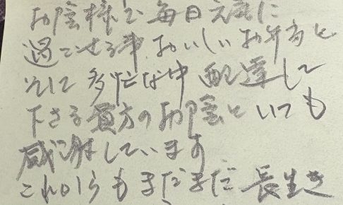 退院後しばらく無理をしないようお弁当を利用されていたお客様。体調も良く今後はご自身でお料理されるそうです。このお手紙は最後の配達時に頂戴したものです。