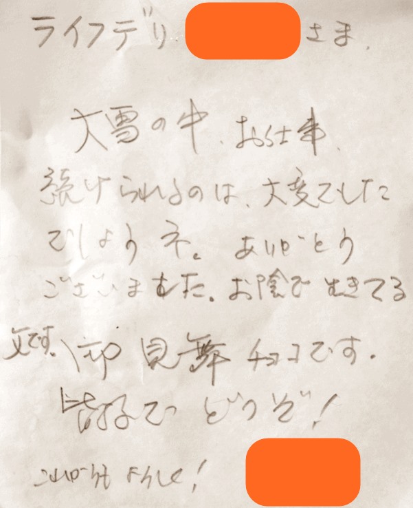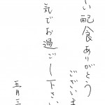 お客様の声2018.06.05 DELILIFE ライフデリ焼津店に感謝のメッセージを頂戴しました。 ライフデリ焼津店に感謝のメッセージを頂戴しました。 「皆々様 親切にされ 嬉しく感激、、有難う 今後ともよろしくね」 労いのことば、こちらこそ本当にありがとうございます。焼津市にお住まいのご高齢のお困りごとがあればすぐに助けに行きますのでご安心ください。 焼津市で、お食事にお困りのご高齢の方、糖尿病・腎臓病の方、そのご家族の方は是非、ライフデリ焼津店にお問い合わせ下さい