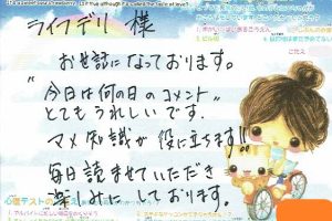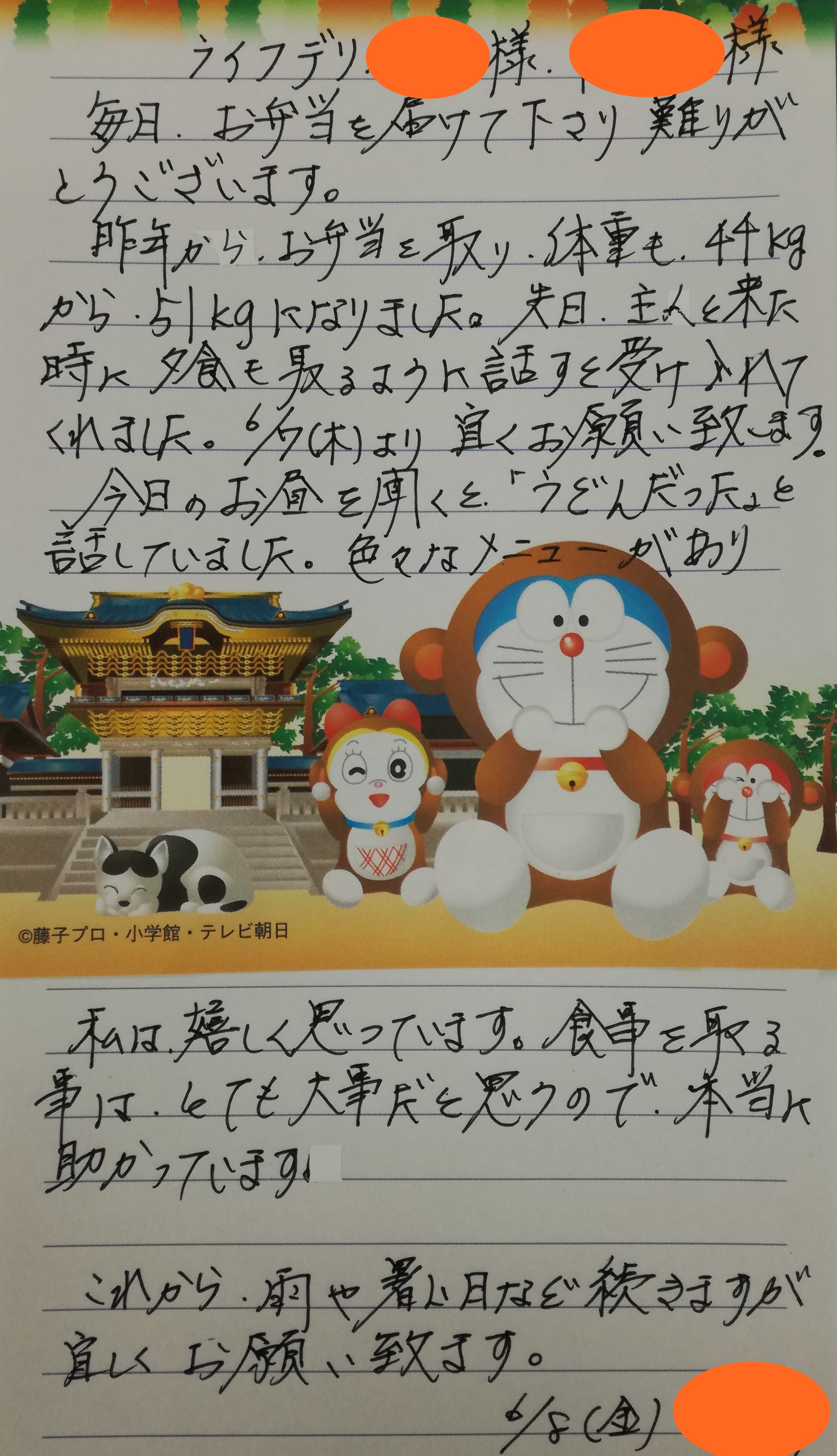 お客様の声2024.05.11 LIFEDELI ライフデリ目黒店にお手紙を頂戴しました! ライフデリ目黒店へのお手紙をご紹介します。 「お弁当配達への感謝とお届け票の一言メッセージへの感銘」とのことです。 配達の時ご本人様から直接感謝のお言葉とお手紙を頂戴しました。特にお届け票一言欄にとても感銘を受けておりました 目黒区でご高齢向けのお弁当をお探しの方、糖尿病・腎臓病の方は是非、高齢者配食サービスのライフデリ目黒店にお任せ下さい。