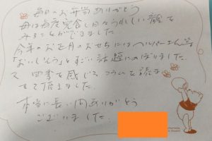 夏バテで食欲が無く元気が無かったお客様でしたが、配食を始めた翌日に感謝のお手紙をいただきました。認知症の方でしたが、配食のことを覚えて下さりお手紙まで書いていただたことにとても嬉しく思いました。今では毎日美味しかったよ、と仰っていただいて感謝の毎日です。ありがとうございました。